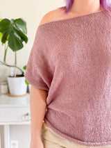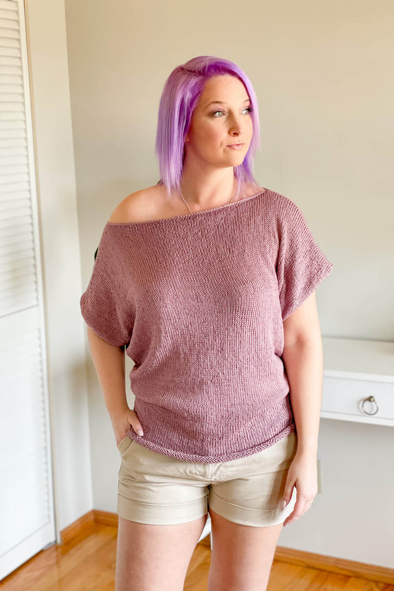 I see that shoulder peeking out, and I am here for it. Slouchy and off the shoulder, the Summer Slip Tee is a bottom-up shirt that looks essentially like a funnel when lying flat. Worked in the round until the underarms, and then worked flat, this teeistighter at the bottom, but gradually increases up through the torso to finally land at roughly 17-23” (43-58 cm) of positive ease on the bust at the widest part. Note: Ease is dependent on your size, so please check the final measurement chart on the last page. This effect gives a super roomy and boxy like shape that has tons of drape due to its bamboo material. With a wide boat neck collar and raw edges, it's perfect to wear to the beach or catch some rays at the patio.