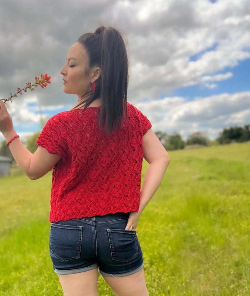 The Summer Vibration Tee is a delicate but durable garment designed with airy lacework in cotton yarn that is essential for the heat of summer. It has an oversized fit with no shaping. The 32 row repeated lacework is easily attainable for the ambitious knitter.