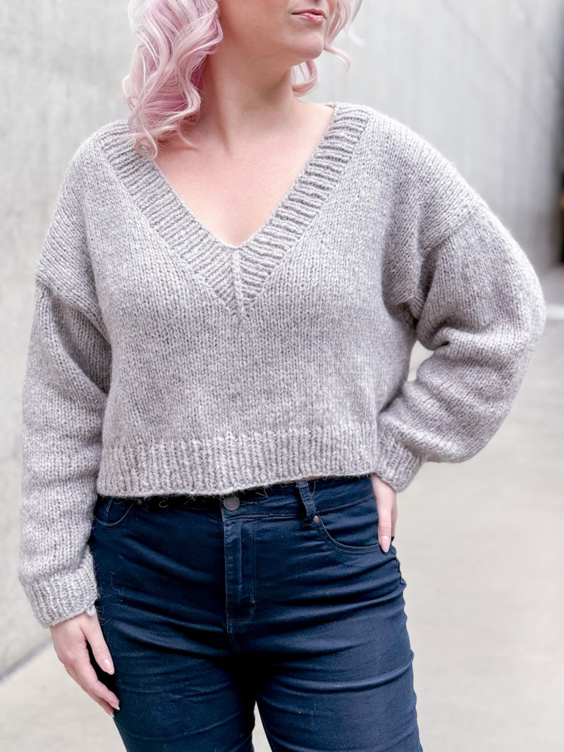 Knit top-down, this oversized drop-shoulder sweater is lightweight, airy, and super snuggly to cuddle up in. The Sweet V Sweater is the matching top to the Sweet V Skirt. With 10-12" (25-30cm) of positive ease, a wide mitred v-neck collar, and a cropped length, this sweater is just begging to be worn with fleece-lined tights, cozy slippers, a cup of cocoa and a fireplace. Though the positive ease might be daunting to sweater makers, this sweater is knit up with US 11/8 mm needles and flies off your needles. Wear it with the V straight on the center or slipped off the shoulder for a chic vibe.
