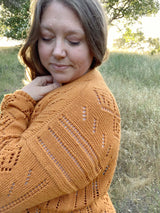 The Freya knit cardigan pattern features lacy details, inclusive sizing and lightweight yarn. The long sleeves and button front make it perfect for cool summer nights.