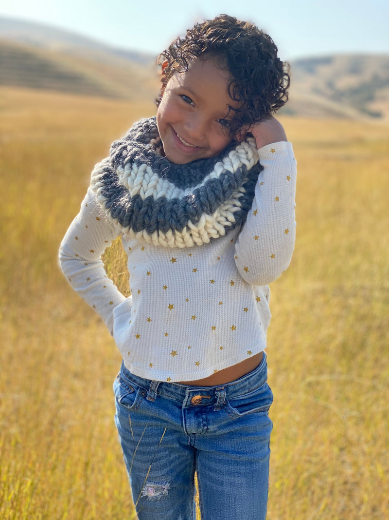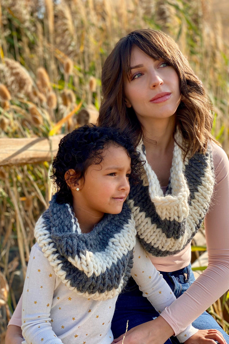 This striped knit cowl is the perfect beginner project! It’s quick to work up if you need a fast gift and the super bulky yarn is easy to work with. Each kit comes with enough yarn to make both an adult and child size cowl, perfect for a “mommy & me” set!