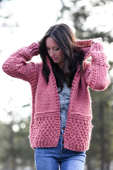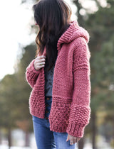 Featuring various textures and chunky fabric, this hoodie is toasty warm and sure to be noticed! The beginner friendly construction makes it doable for knitters of all ability levels. As you make this sweater, you’ll love moving through the different stitch patterns including, stockinette, Irish moss stitch and seed stitch. Get ready to cozy up with your comfy new sweater!
