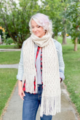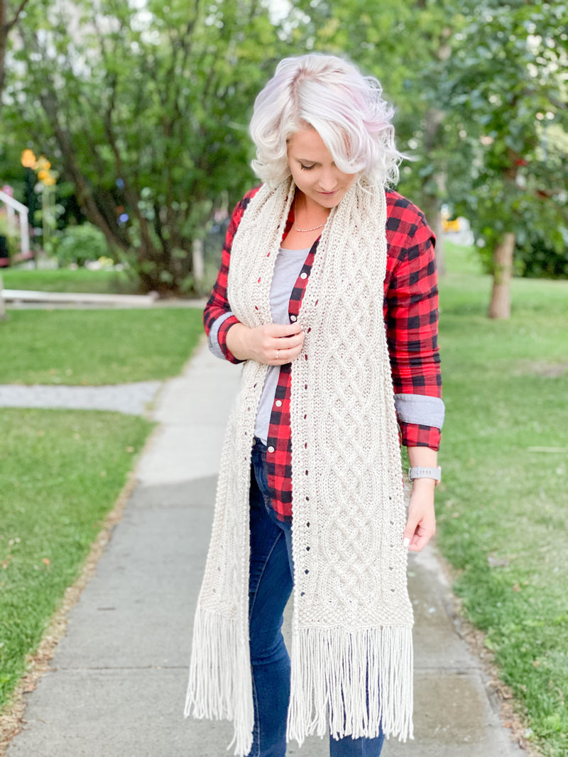 Cables were always been my end goal as a beginner knitter. The twists and turns are so elegant and depict a journey from one end to the other. So many paths crossing. Turas; means “journey” in Gaelic, which I found quite fitting for this scarf. This was actually my first design with Celtic knot, and I can tell you; if you can focus, follow stitches, and trust the pattern, this scarf will knit up like a dream. Designed with the cable as your center piece, a two stranded cable and eyelets adorn each side. For a finishing touch they are bookended with a seed stitch border. With the sheer width of this scarf, and its stunning tassels, this piece is unbelievably perfect.