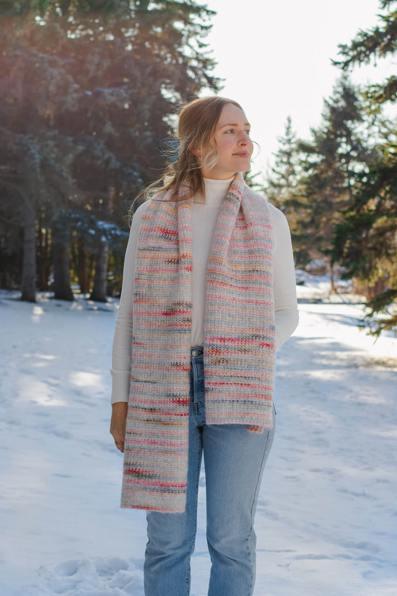 Wrap yourself in the dreamy softness of the Watercolor Scarf, a delicate, pastel-hued winter accessory that feels as light as a cloud. The gorgeous tonal blend of colors of Scarfie Lite create a watercolor effect when knit up, inspiring the name of this design. With a beginner-friendly stitch pattern and a mindless 2-row repeat, the Watercolor Scarf is the perfect winter accessory to knit while cozying up on the couch on a blizzardy day.