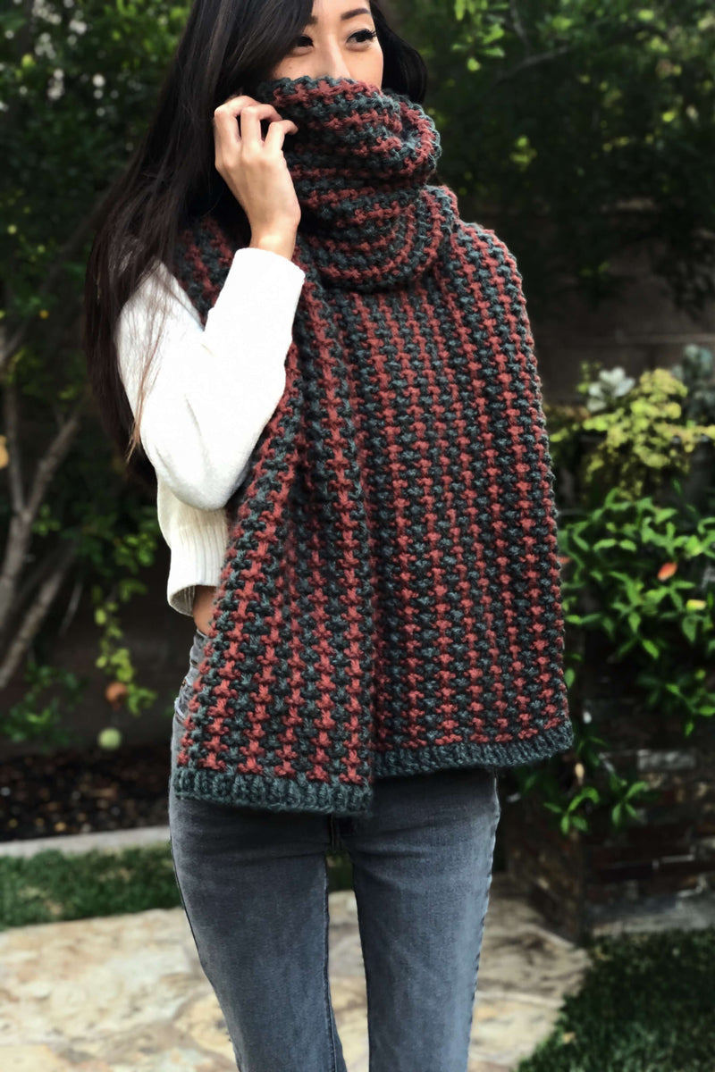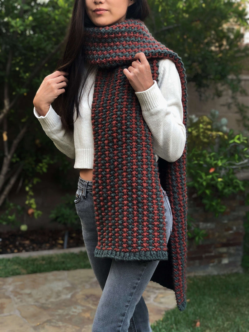 The Willow Blanket Scarf is knit using a simple technique called mosaic knitting. It’s the perfect intro to colorwork for beginners. The stitch pattern is created by using a series of slip stitches which brings the contrast color over the main color and vice versa. Hue + Me provides tons of color options and is the perfect yarn to feature this extra cozy scarf. Choose a main color for the ribbing and a contrast color to make it pop and let's get knitting!