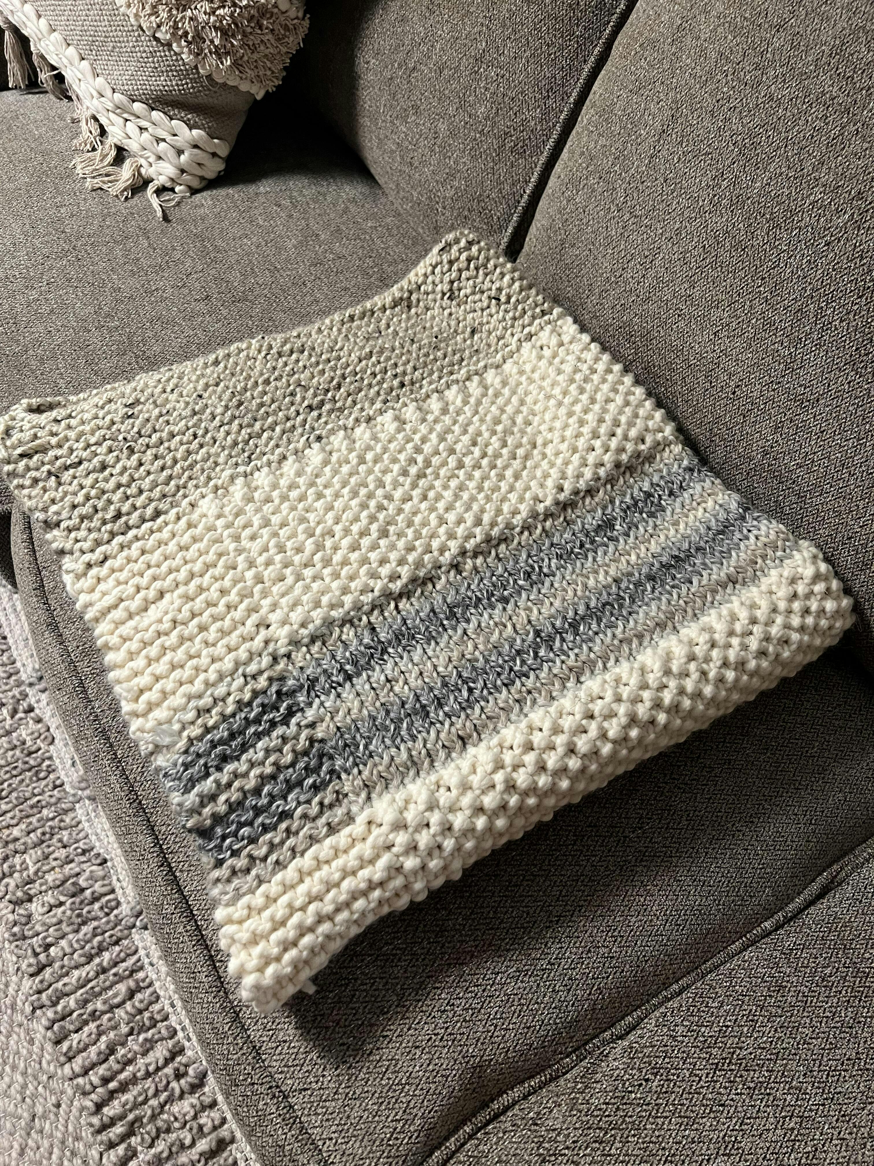 Chunky yarn and simple textures make this winter throw both fun and beautiful! Using three stitch patterns to create lofty textures and interesting striping, you’ll find that this blanket holds your attention yet is easy to make. Understated and timeless, it’s sure to be appreciated in any space, whether modern or traditional. Easy enough for beginners and those just getting back into knitting, yet fun for all!