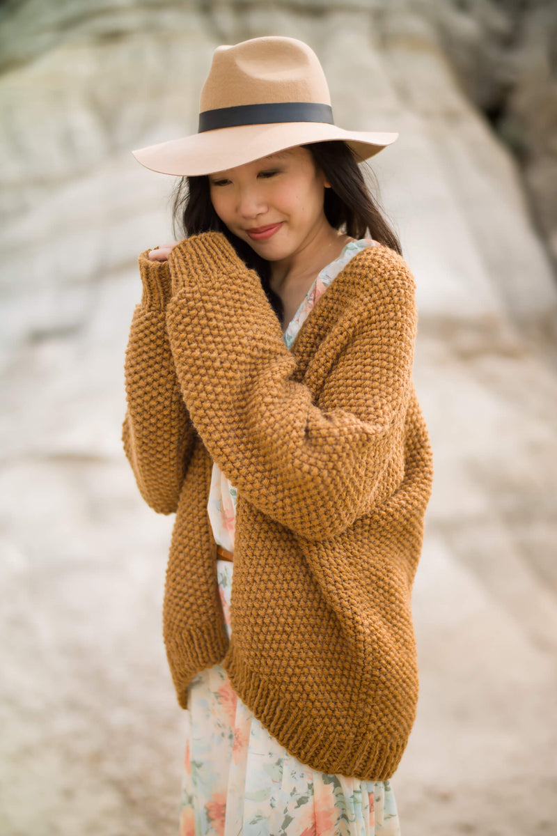Knit this beautifully textured cardigan using bulky yarn and the lovely seed stitch! The Woodbury Cardigan will become your favorite chunky cardigan with its relaxed, oversized style and gorgeous drape. Wear this cardigan over your favorite dresses, jeans and leggings and add an extra layer of chic coziness!