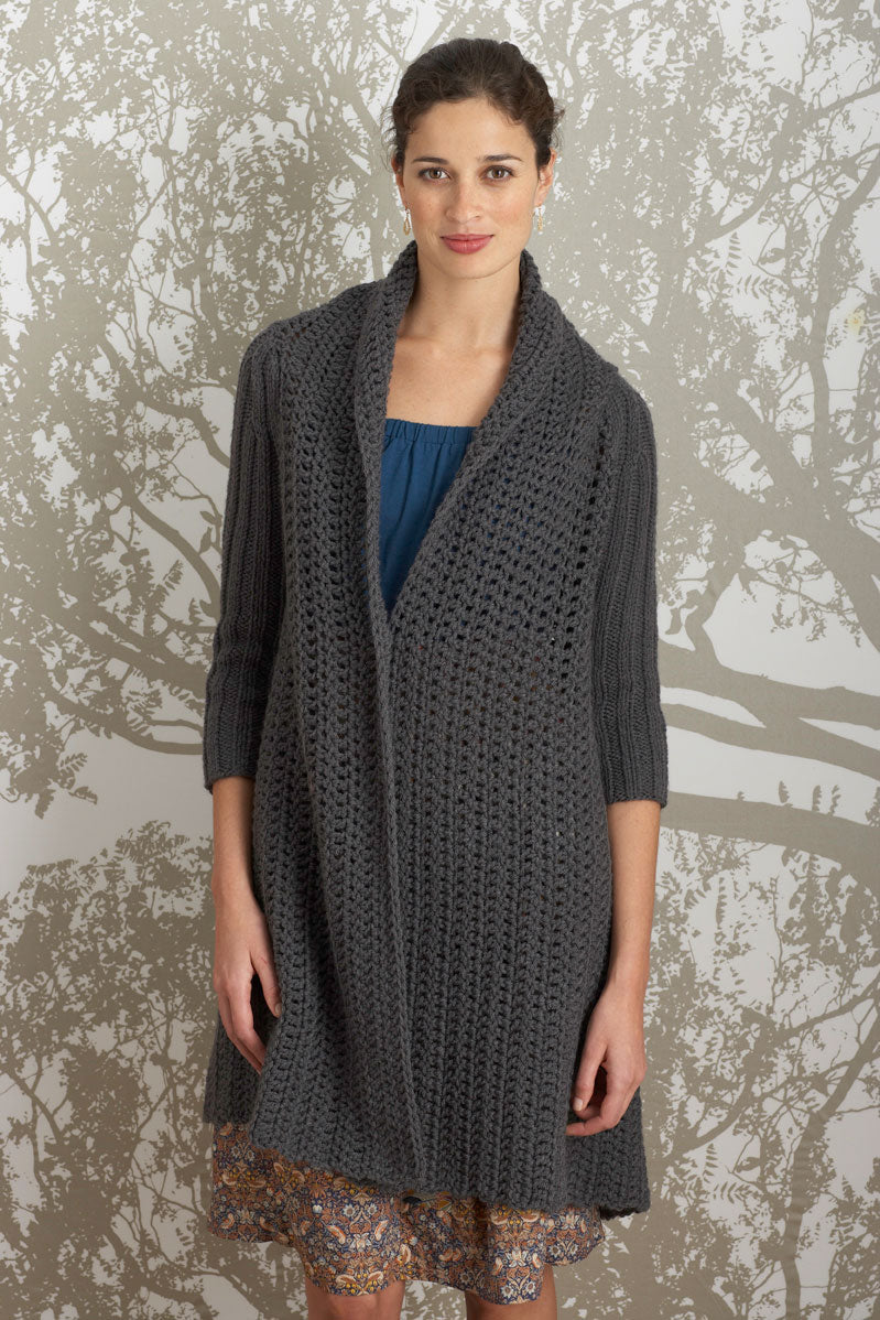 The Winged Jacket Pattern is a knit-crochet cardigan pattern made with medium weight yarn that has a skill level of intermediate.