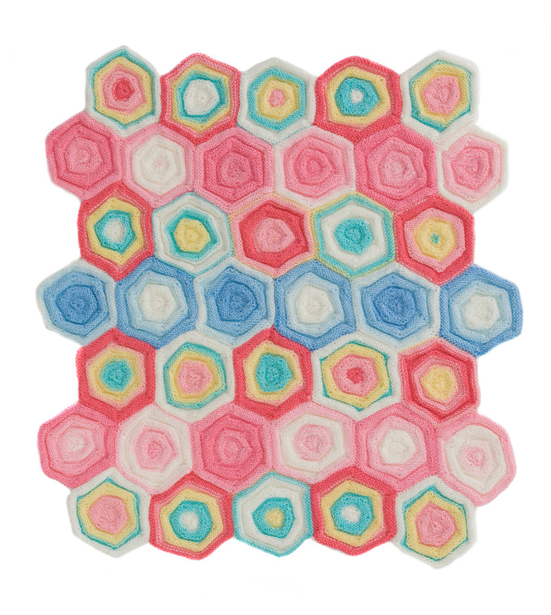 One Hexagon motif = about 5 ? in. (14 cm) across at widest point.;