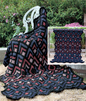 The Homespun Mitered Afghan Pattern is a knit afghan pattern made with bulky weight yarn that has a skill level of expert.
