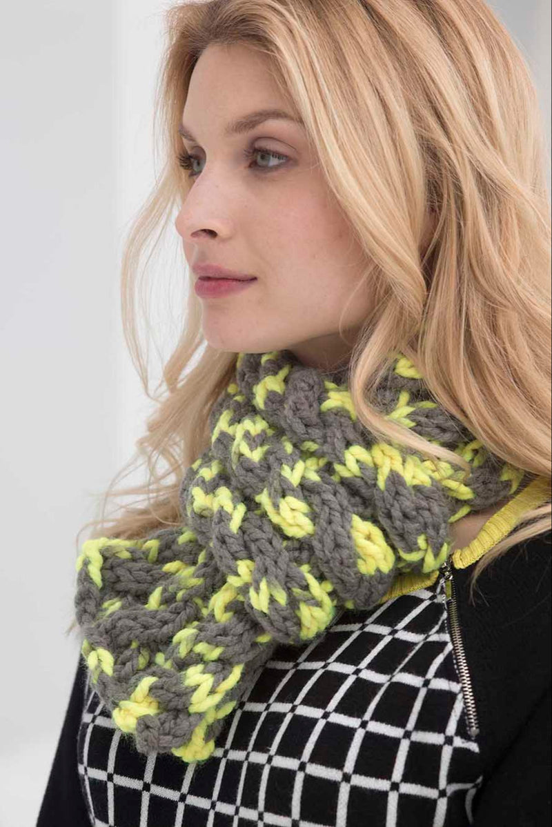 The Neon Cabled Scarf Pattern is a knit scarf pattern made with super bulky weight yarn that has a skill level of intermediate.