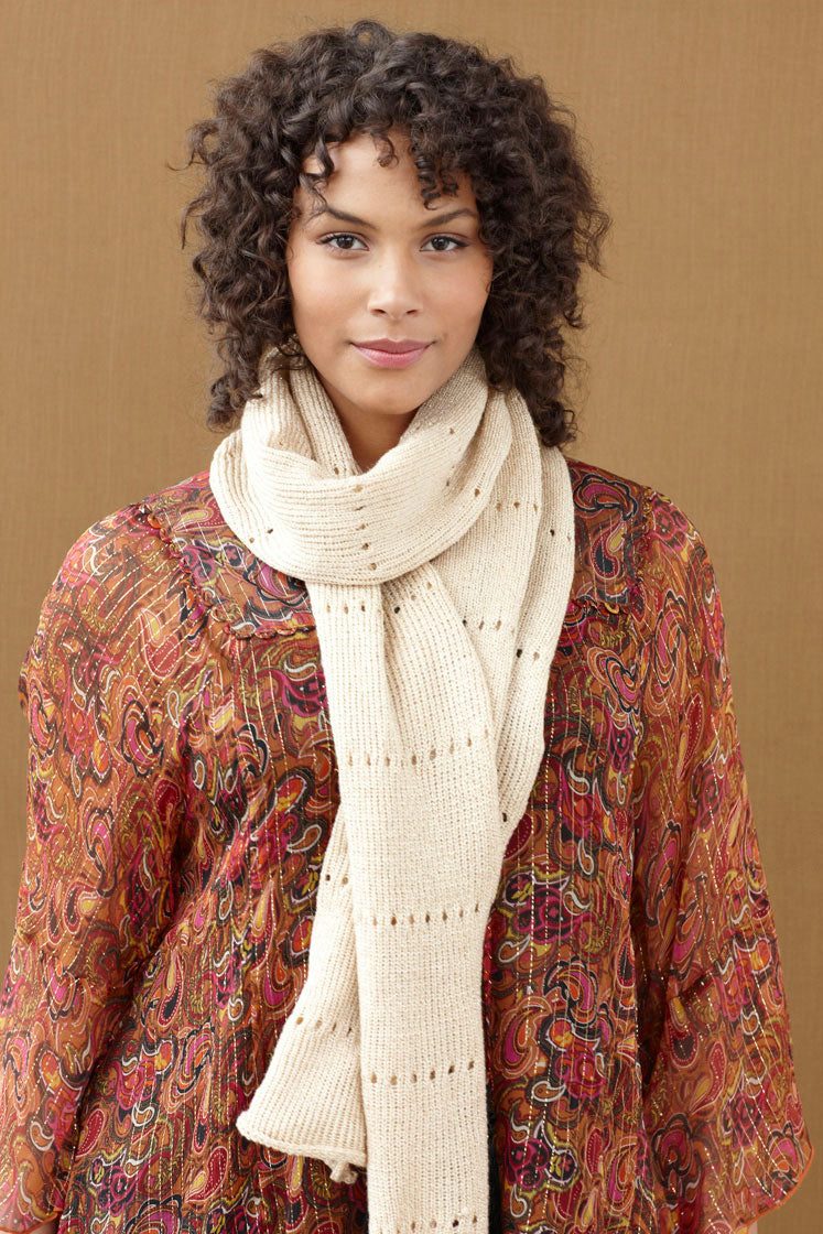 The Shangri-La Scarf is a knit scarf pattern made with fine weight yarn that has a skill level of advanced.