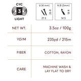 Cotton Bamboo is a sport-weight yarn blending 52% cotton and 48% rayon from bamboo, offering the perfect balance of breathability and silkiness. This yarn is ideal for crocheted and knitted summer tops, baby blankets, and airy accessories. The bamboo fiber adds a subtle sheen and cooling effect, making it a great choice for warm-weather wearables. Machine washable and lay flat to dry.