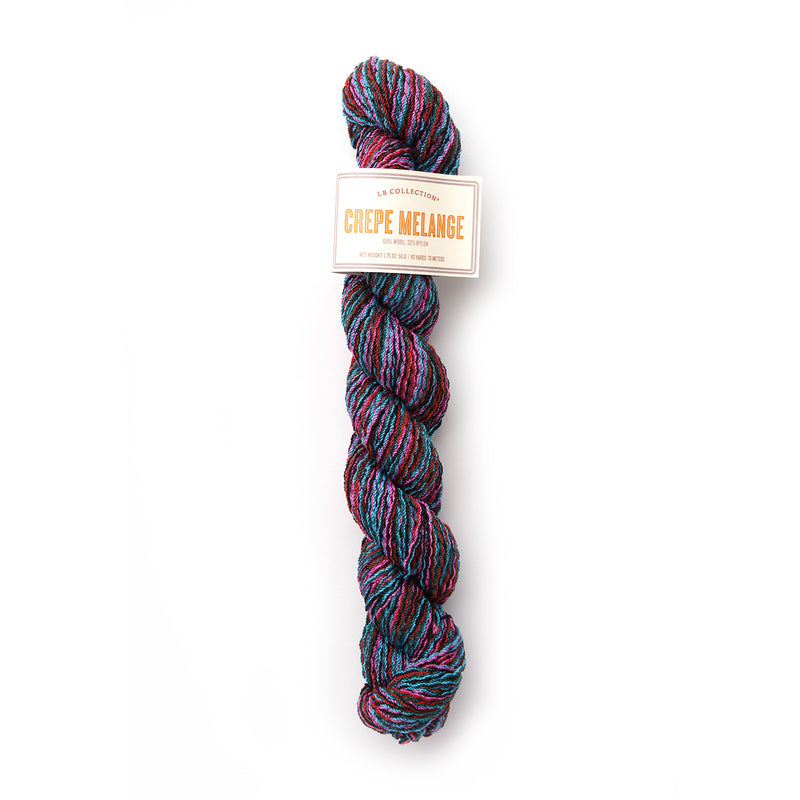 A perfect companion to LB Collection® Crepe Twist, Crepe Melange is a yarn constructed of 5 fine strands of the Crepe Twist. The 5 different colors are bound together by a single black thread. The gauge and colors of the yarn were designed to coordinate with Crepe Twist, so that they could be used together in the same project. Crepe Melange produces a tweed fabric with great definition and drape, which will create a high fashion looking garment or accessory.