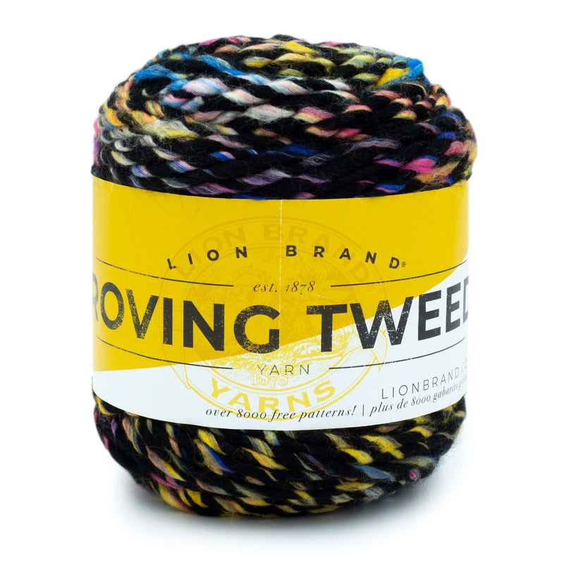 This CYC #6 single ply (roving) yarn is super bulky, super soft, and super fun! Multi-color tweed flecks are spun with a solid base for that classic tweed look. Cables, all-over texture, and basic stitches can all be paired with Lion Brand Roving Tweed. 100% acrylic makes this yarn machine washable, but lay your projects flat to dry. 156 yards per 150 gram skein.