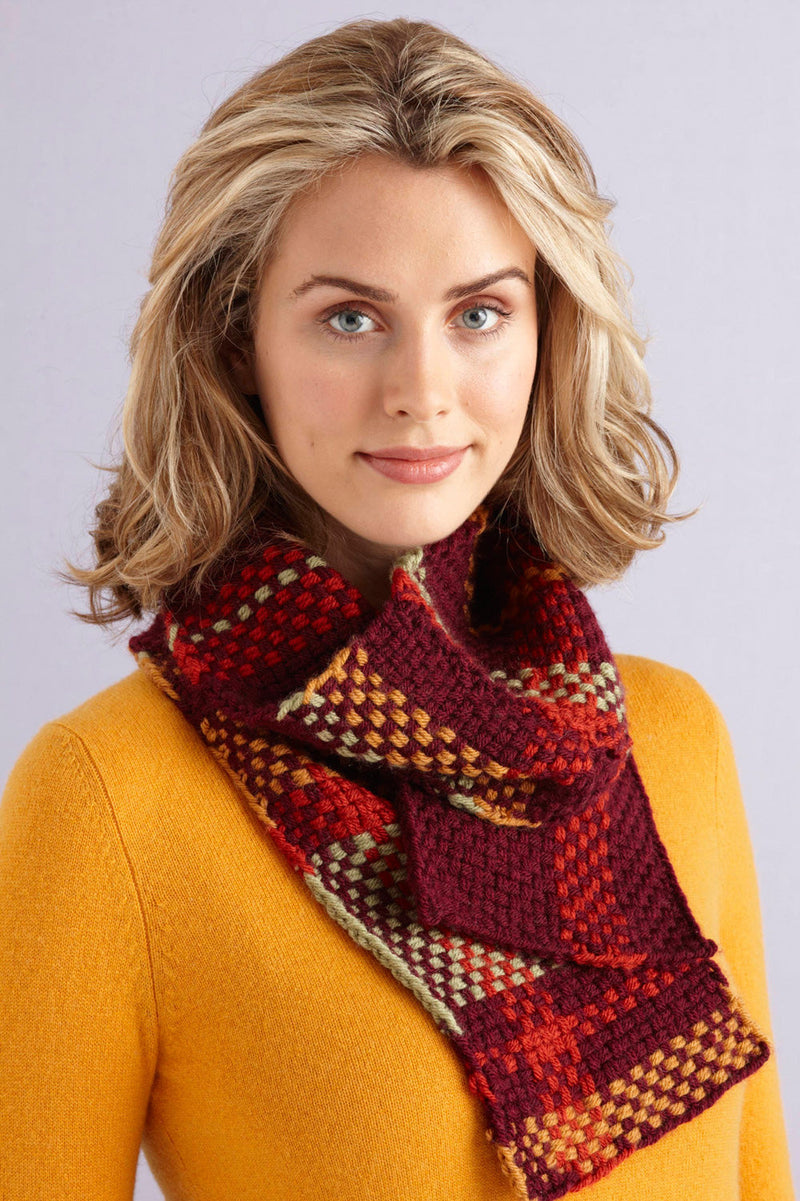 The Rich Plaid Loom Woven Scarf is a loom-weave scarf pattern made with medium weight yarn that has a skill level of expert.