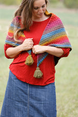 The Mandala Pretty Puffs Scarf is a gorgeous triangle scarf with a perfect blend of warmth and style! This eye-catching scarf features the lovely self-striping Mandala yarn with ombre colors transitioning beautifully across its triangular shape. Crafted with a cozy puff stitch pattern, it offers a soft, textured feel that adds both comfort and charm to any outfit. The simple one-row repeat makes it an accessible project for crocheters of all skill levels, while the large tassel embellishments at each corner provide a playful, bohemian flair. Ideal for chilly days or as a statement accessory, this scarf is a must-have for those who love handmade, colorful pieces. Wrap yourself in creativity and warmth with this delightful crochet creation!