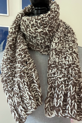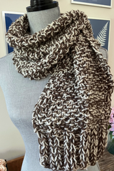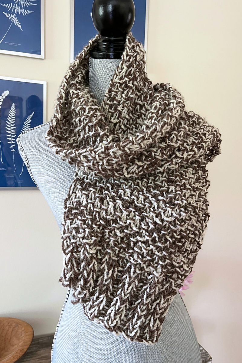 Two strands held together on large needles make a stylish, stash busting accessory with endless color combinations. Solids work well, but if you’re feeling adventurous, try adding variegated or multicolored scraps for colorful, cozy goodness. The easy keyhole closure keeps the scarf secure at the neck in an effortless, chic way, and the long, chunky ribbing keeps it modern and fresh.