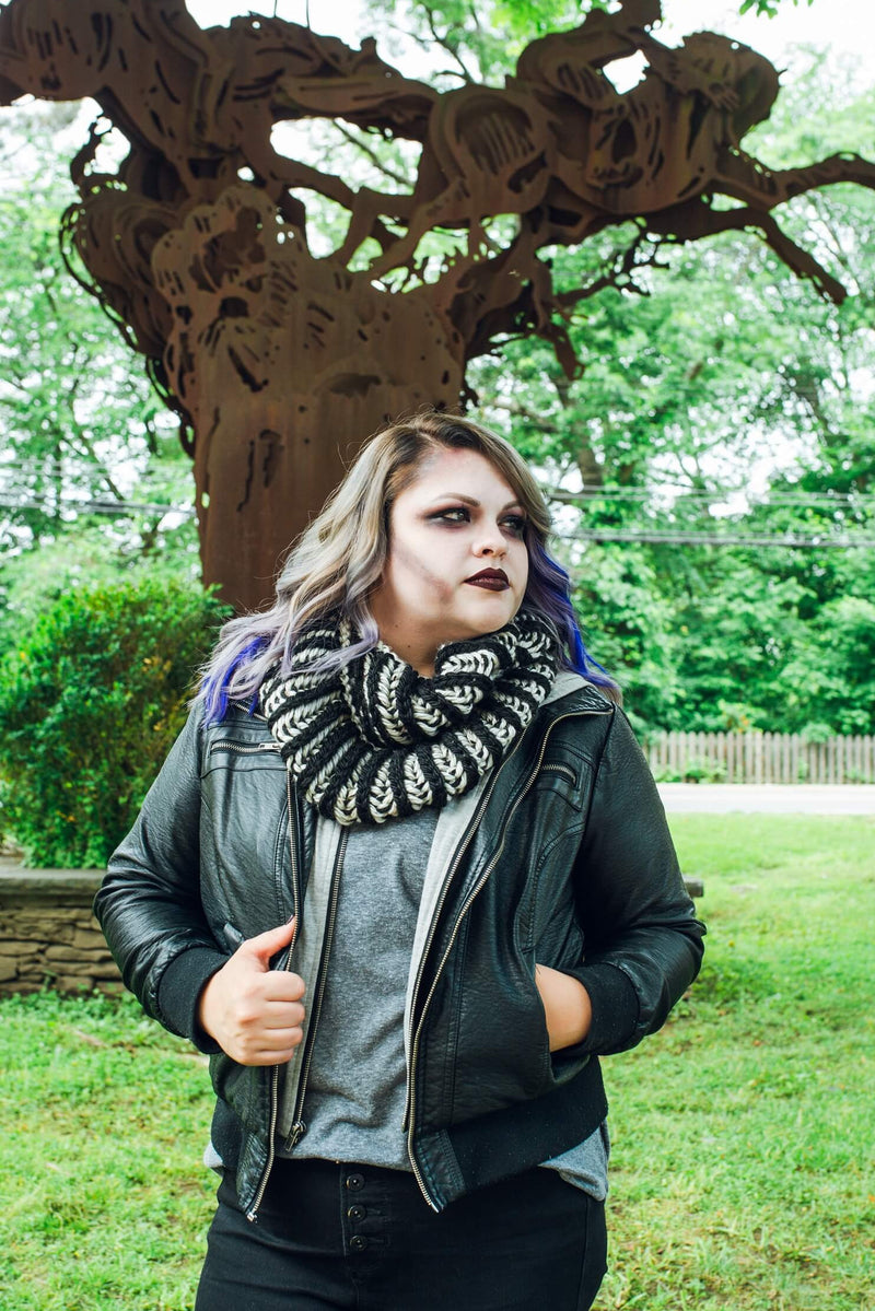 The Midnight Brioche Cowl is a knit cowl pattern made with super bulky weight yarn that has a skill level of intermediate.