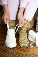 Finished Foot Circumference About 7 1/2 (8 1/2, 9 1/2) in. (19 (21.5, 24) cm), foot length is adjustable