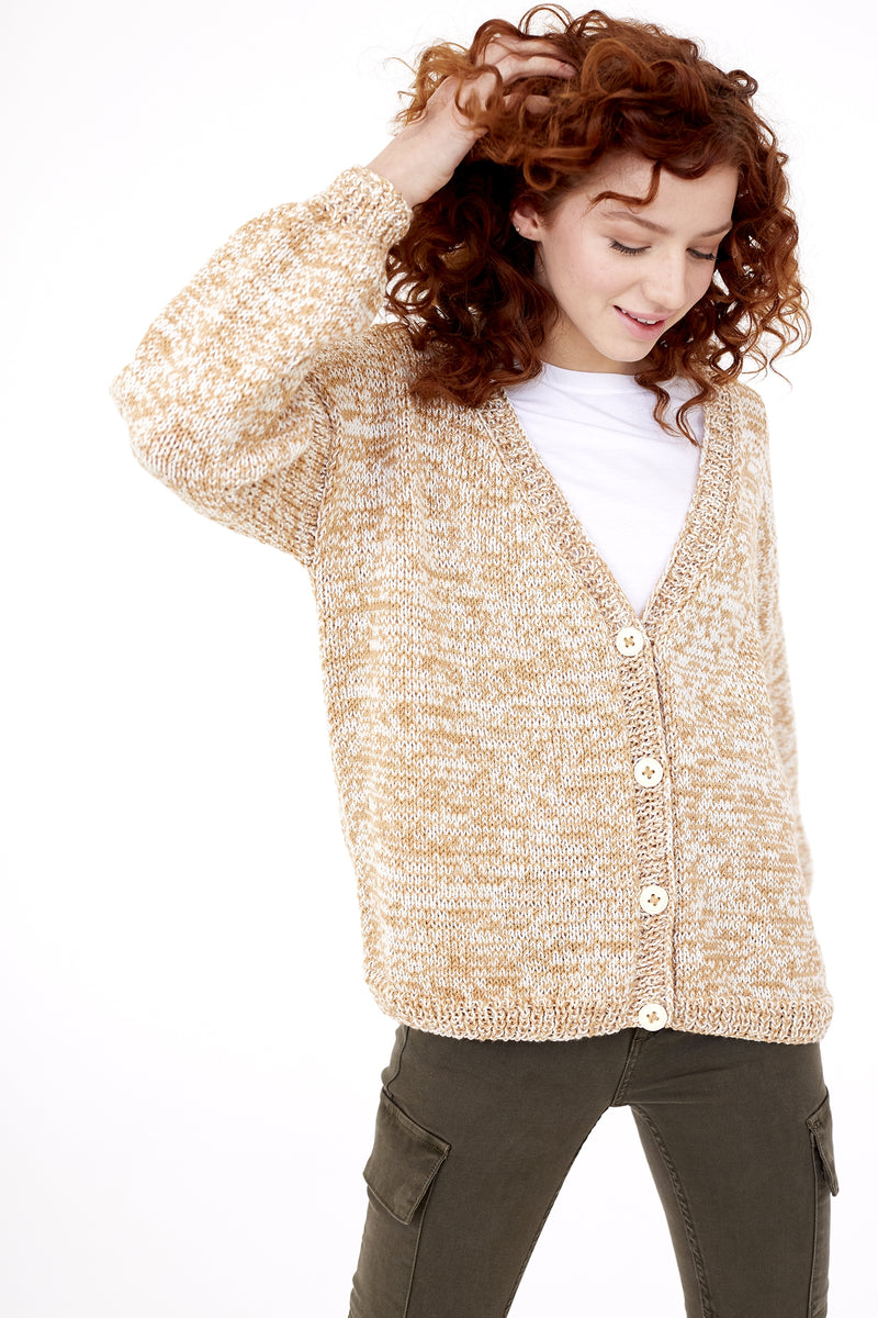 16 sts + 23 rows = about 4 in. (10 cm) in St st (k on RS, p on WS) with larger needle and 2 strands of yarn held tog