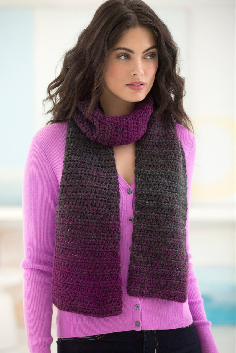The One Ball Crocheted Scarfie - Version 12 is a crochet scarf pattern made with bulky weight yarn that has a skill level of beginner.