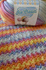 The blues, yellows, oranges, pinks, and purples of the Parfait Lion Brand Ice Cream yarn create a sweet and cheerful baby blanket that’s just right for a day at the park. This soft #3 weight yarn is machine washable, dryable, and oh-so-gentle on baby's skin. A simple stitch pattern keeps things snug and secure for tiny fingers.