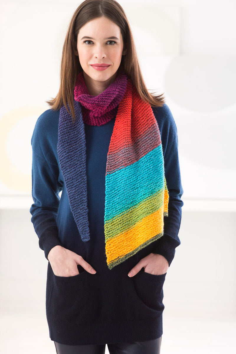 The Pennant Scarf is a knit scarf pattern made with light weight yarn that has a skill level of easy.