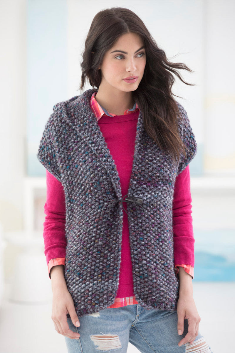 The Powder Ridge Hooded Vest is a knit vest pattern made with super bulky weight yarn that has a skill level of easy.