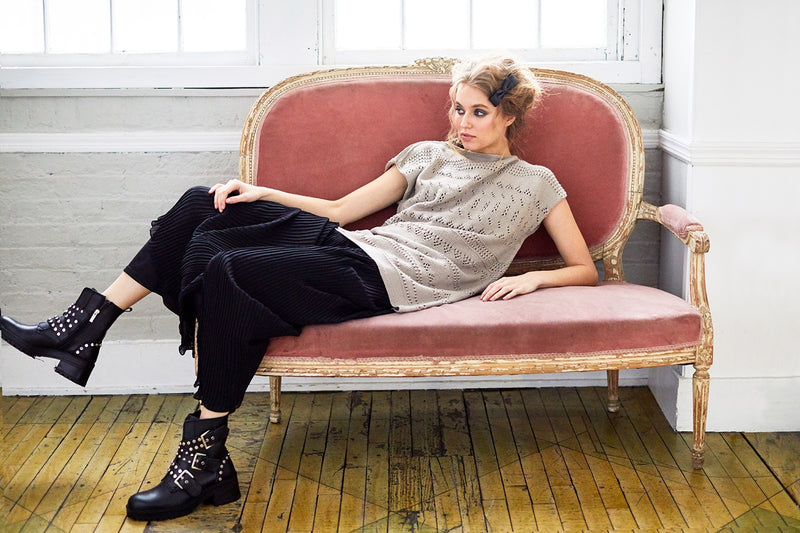 The Psyche Pullover is a knit sweater pattern made with light weight yarn that has a skill level of intermediate.