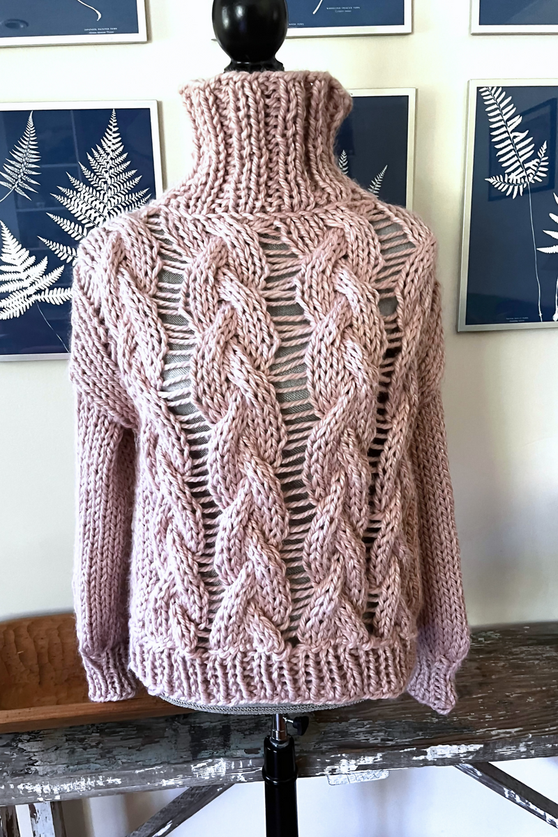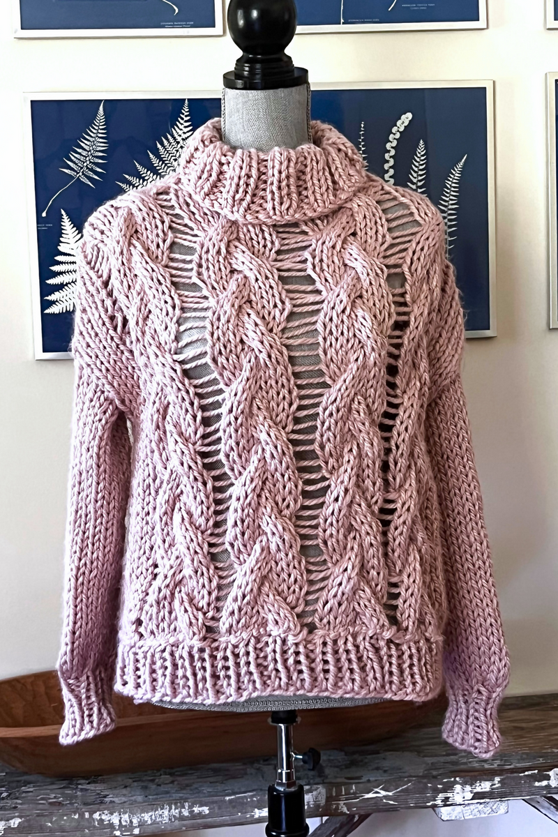 Cozy and oversized, but not so big that it’s overwhelming, this sweater knits up quickly with bulky yarn and large needles, and the dropped stitches take it from hey to YAY! An easy pattern repeat makes the body panels effortless and I’ve also included a few options for a turtleneck or crew neck, as well as a full length body, or a cropped shrug, necklines and lengths, making this project customizable for your personal style. Any way you like it, don’t skimp on blocking, the stitches will appreciate a good stretching out and you will love the finished garment… PROMISE!