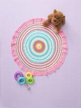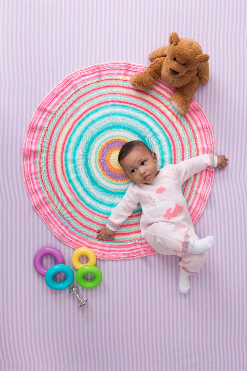 72 sts in the round= about 7 1/2in. (19cm) in diameter.