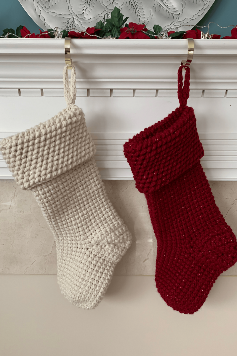 Add a rustic touch to your mantle this holiday season with this beautiful crochet stocking pattern. This stocking can hold plenty of goodies from Santa as it approximately measures 10 inches wide by 20 inches tall once completed. The pattern includes directions for an optional lining for the stocking and two different options for the cuff. One option is to crochet the cuff and the other is to use fabric so that you can personalize the cuff with cricut, embroider, iron on, paint, or cross stitch. Customize this pattern in any color and it makes a perfect gift, a product to sell, or enjoy it for yourself.