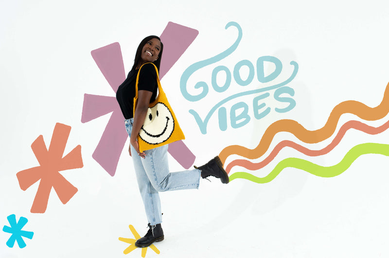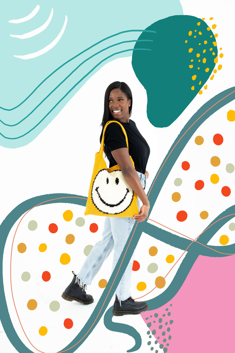 The Smiley Face Tote is a crochet pattern made with medium weight yarn that has a skill level of easy.