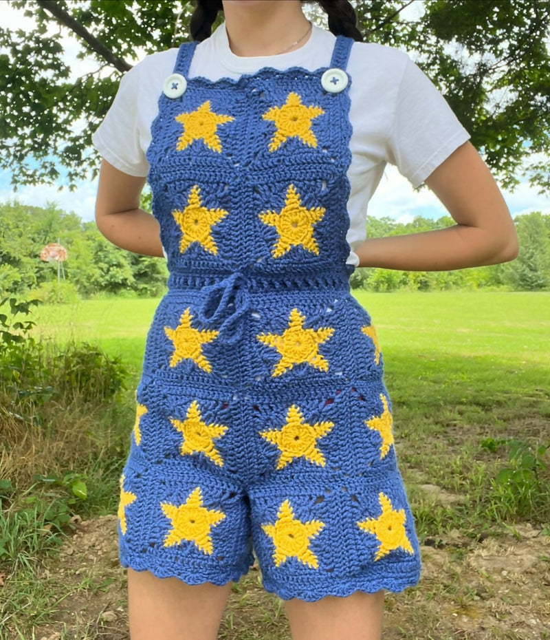 Perfect for anything from casual outings to fun festivals, the Staralls are made to help you shine! This pattern combines a classic high-waisted overall shorts design with a patchwork look and standout stars. Beginner-friendly, step-by-step photos, sizes XS-5XL with instructions to adjust.