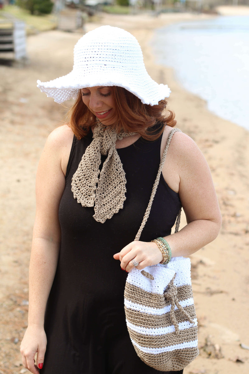 Transform a basic tee or little black dress with the Summer Crochet Essentials Set. This pattern set includes a sunhat, drawstring tote, and kerchief made with a sturdy mercerized cotton yarn. These classic spring, summer, and vacation accessories can be styled in many ways, together or separately, to take a simple outfit to the next level.
