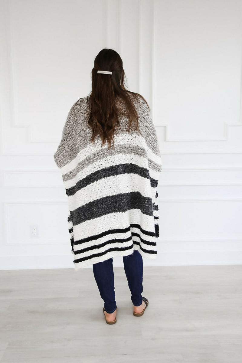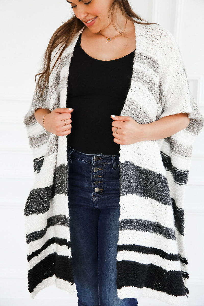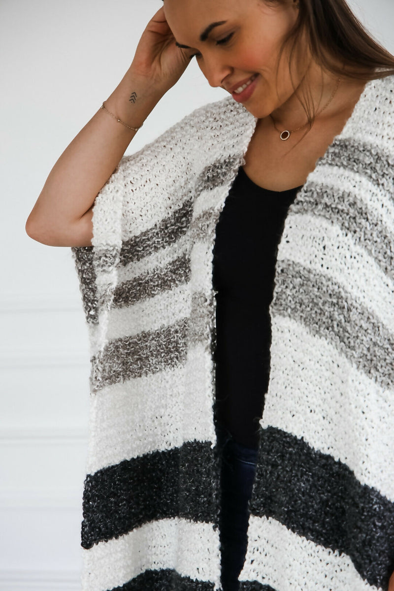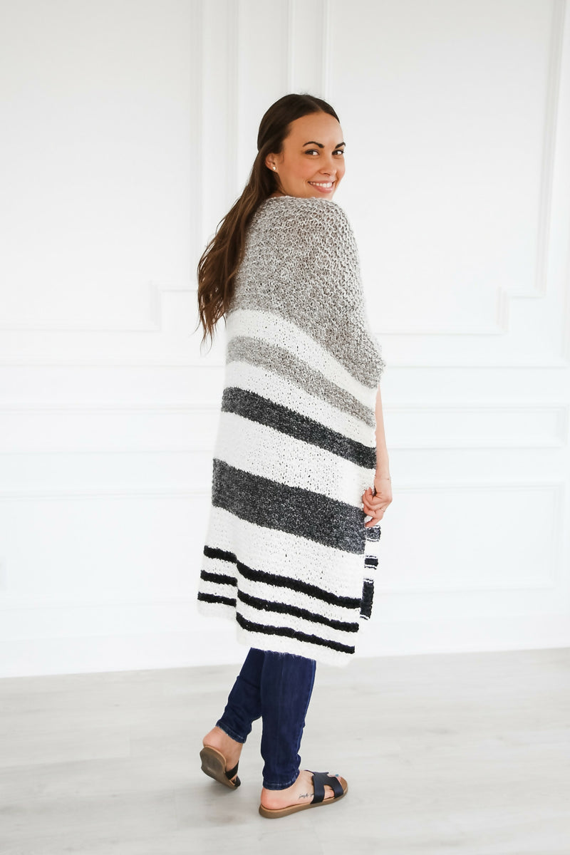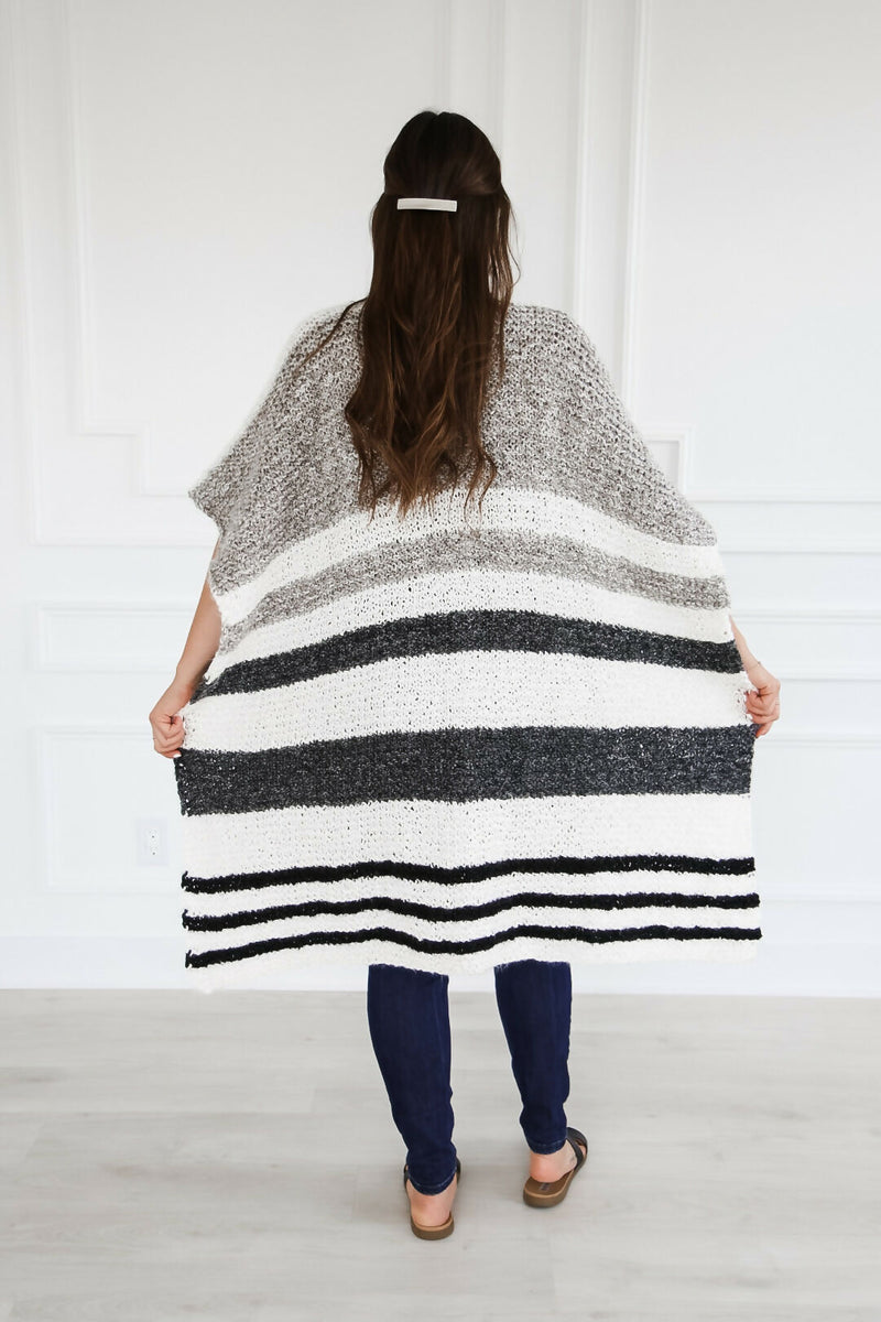 The Sunrise Poncho is an oversized wearable cape worked flat in one piece. You’ll start with the back panel, then put some stitches on hold for the right panel before casting off some stitches for the neck space and working with the leftover stitches back and forth to create the front left panel. You’ll then re-attach the yarn and knit back and forth to create the front right panel.