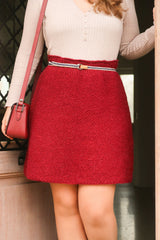 This knitted skirt is completely adjustable in length, so you can customize it for any look. It is a high-waisted, straight-cut skirt.