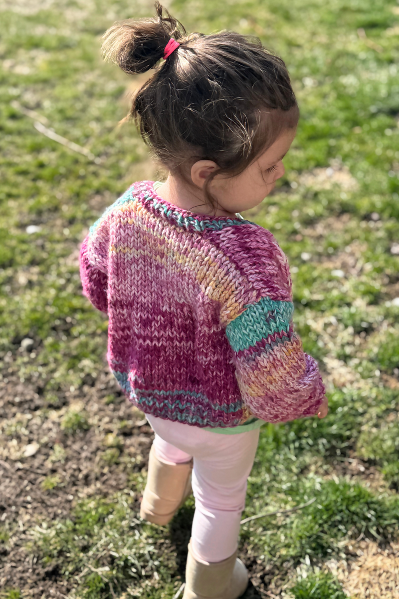Sample sweater is shown in the 24-30 month size on a 2-year-old.
