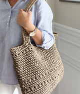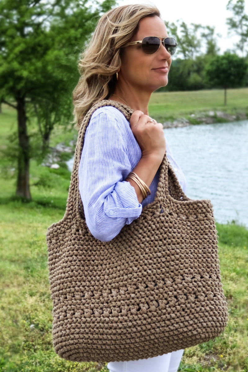 This pattern was first published in Homespun Magazine. Perfect for your next getaway, the Weekender Bag is an easy crochet pattern that works up quickly with a double strand of Lion Brand Rewind Tape Yarn and a 9 mm crochet hook. I have include a full YouTube tutorial in the pattern for making the bag. I have also included photos in the written pattern that demonstrate how to make the leather tassel.
