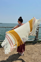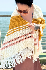 Wrap yourself in cozy comfort with this beginner-friendly knit wrap made using Lion Brand’s InstaKnit™ yarn. Worked mostly in squishy garter stitch, this project is perfect for relaxing knit sessions, whether you're on the couch or by the coast. Eyelet accent bands created with simple k2tog yarn overs add a touch of texture and interest at each end—but they’re totally optional if you’d prefer to stick with classic garter throughout. Finished with generous fringe and bold color blocking, this oversized wrap is as fun to make as it is to wear.