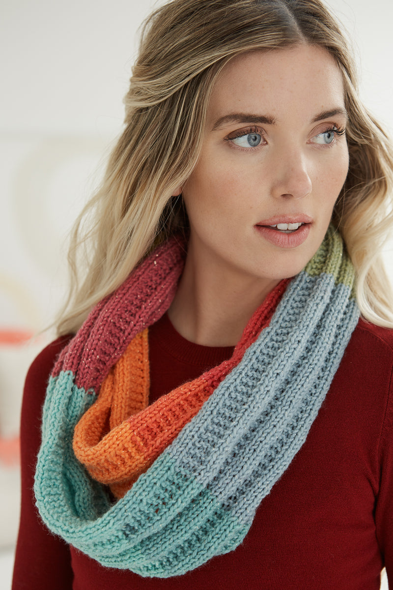 The Urbana Cowl is a knit cowl pattern made with light weight yarn that has a skill level of beginner.