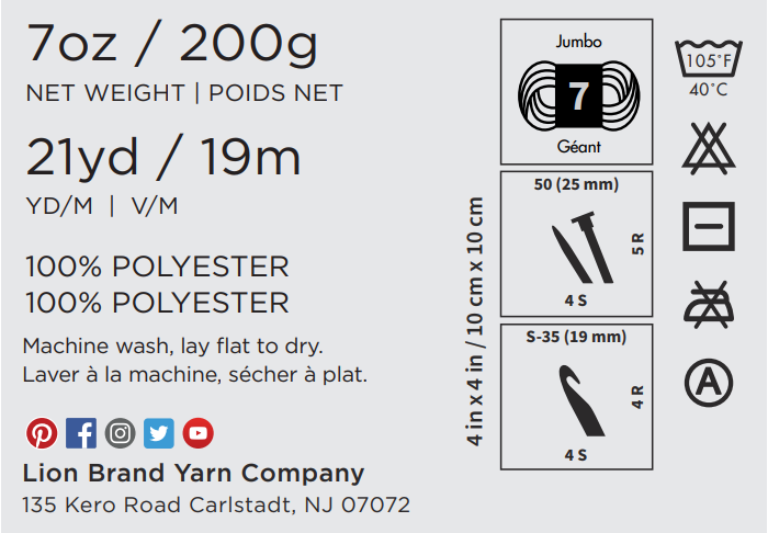 Make it Fast. Make it Soft! This jumbo yarn packs 200 grams (21 yards) of chainette construction soft velvet into each ball. It’s 100% polyester, which makes it machine washable and 100% loveable by all. Whip up quick projects like afghans and pillows or get creative with crafts and home décor.