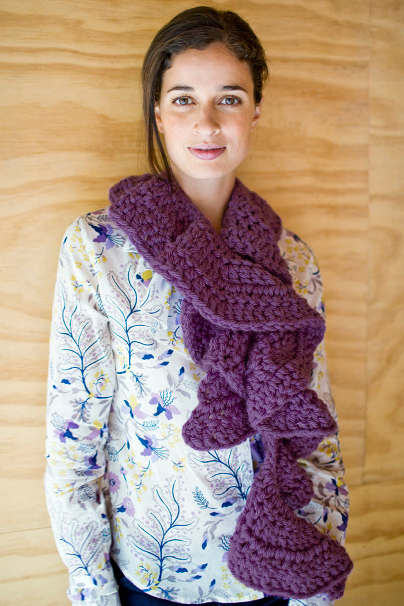 The Vintage Ruffles Scarf is a crochet scarf pattern made with super bulky weight yarn that has a skill level of beginner.