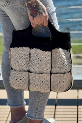 Say hello to your new favorite warm-weather bag! This cute and sturdy crochet tote is made with Lion Brand’s Cotton Hemp yarn—a soft and breathable worsted-weight blend that’s perfect for sunny days and everyday adventures. The body of the bag is crafted from six classic granny squares in a natural shade, giving it that timeless handmade charm. It’s all tied together (literally!) with bold contrasting black edging and a solid black top and handle, making it pop with personality. Whether you’re heading to the farmer’s market, beach, or just out and about, this bag’s got your back—stylishly.