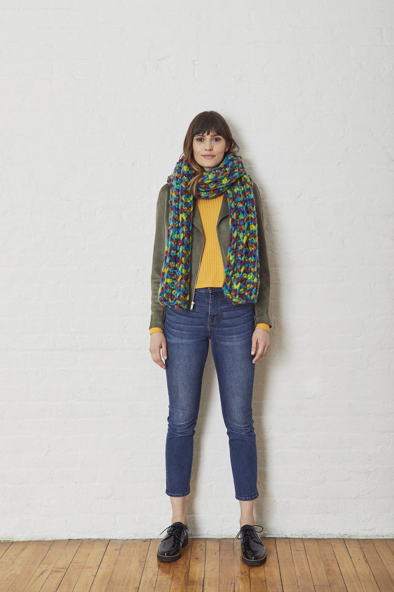 The Woodbury Scarf - Version 1 is a crochet scarf pattern made with jumbo weight yarn that has a skill level of beginner.